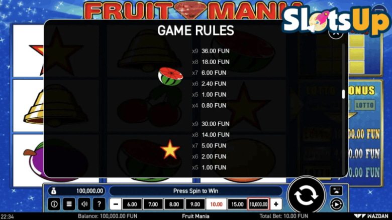 Met inzetgroottes variërend van een bescheiden 0,20 tot 10.000 is de Fruit Mania demo geschikt voor verschillende inzetvoorkeuren. Ik vond het inzetniveau erg handig omdat ik mijn inzet naar eigen voorkeur kon instellen. Je kunt dus de muntwaarde aanpassen aan het niveau waar jij je goed bij voelt. De RTP van Fruit Mania is 96,59% en de hitfrequentie is 13,16%.