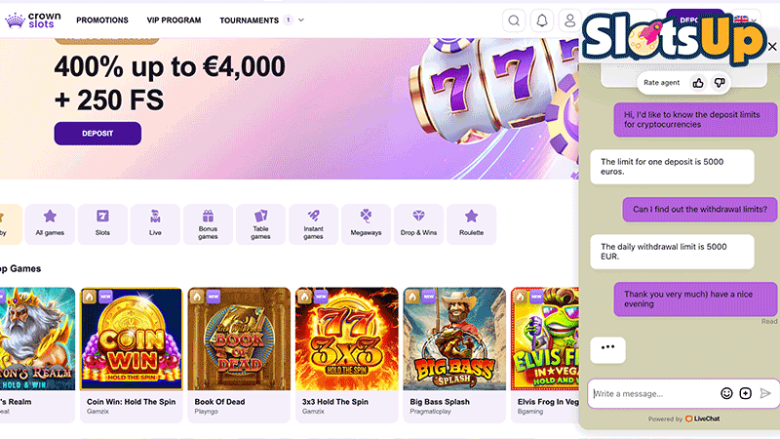 CrownSlots Casino ondersteunt meerdere talen voor een breed publiek, waaronder Engels, Duits, Italiaans en Frans. Deze meertalige aanpak verbetert de toegankelijkheid voor spelers uit verschillende regio's.