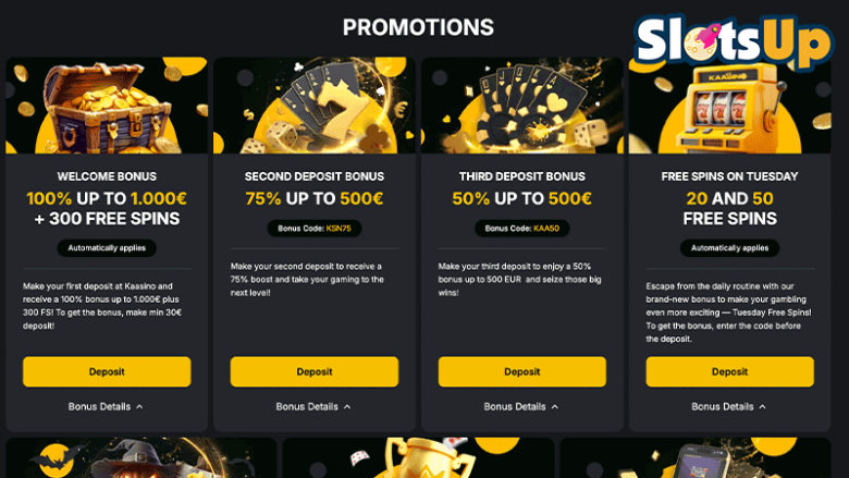 Als je niet geïnteresseerd bent in Kaasino bonussen, bezoek dan de lijstpagina's van SlotsUp om de bonussen te vinden die beschikbaar zijn in jouw land en filter ze op jouw voorkeuren.