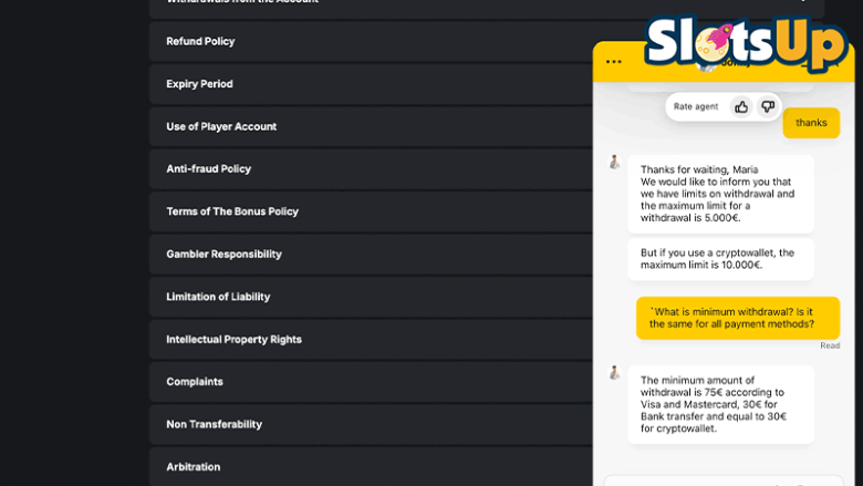 Tijdens het testen van Kaasino ontdekte ik dat de site een gebruiksvriendelijke interface biedt met gemakkelijke toegang tot alle casinofuncties. De algemene voorwaarden omvatten essentiële punten zoals opnamevereisten, beperkte landen en accountregels. Beperkte betaalmethoden kunnen echter het gemak voor sommige gebruikers verminderen en meldingen van langzame opnames kunnen een nadeel zijn.